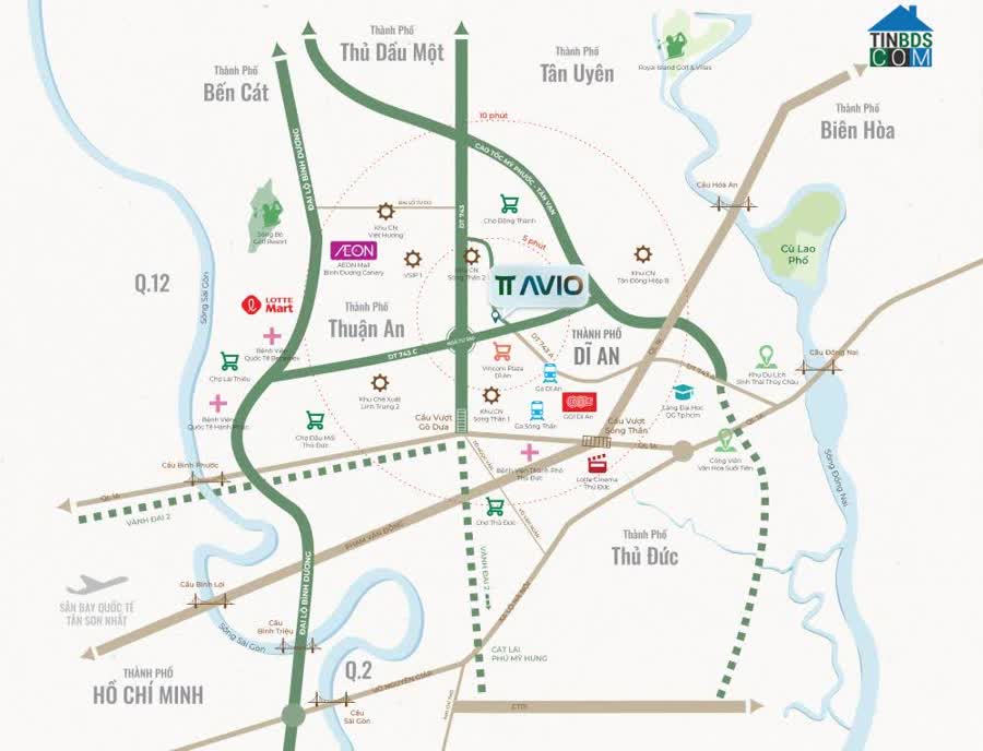 Với vị trí trung tâm Dĩ An, từ TT Avio có thể dễ dàng di chuyển tới Vincom Dĩ ạ (chỉ hơn 1km). Chỉ 2 tới 10 phút di chuển là tới KCN Sóng Thần 1, KCN Sóng Thần 2, BVQT Becamex, BV Quân Đoàn 4, Ga Dĩ An, Trường Mầm Non, Trường Tiểu Học, UBND TP. Dĩ An,....