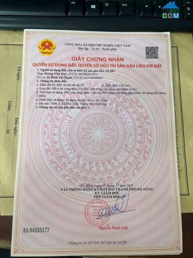 Chính Chủ CẦN BÁN Đất MT Đường Bê Tông Tại Thôn Khương Mỹ, Xã Hòa Phong, Hòa Vang, Đà Nẵng. - Diện Tích: 122, 8m2 trong đó 120m2 đất ở - Giá bán: 860 triệ..