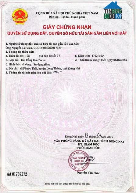 CHÍNH CHỦ CẦN BÁN GẤP ĐẤT THỔ CƯ CÓ VỊ TRÍ ĐẸP GẦN SÂN BAY LONG THÀNH Vị trí: Ấp 9, xã Bình Sơn, huyện Long Thành, tỉnh Đồng Nai Diện tích: Tổng 222..