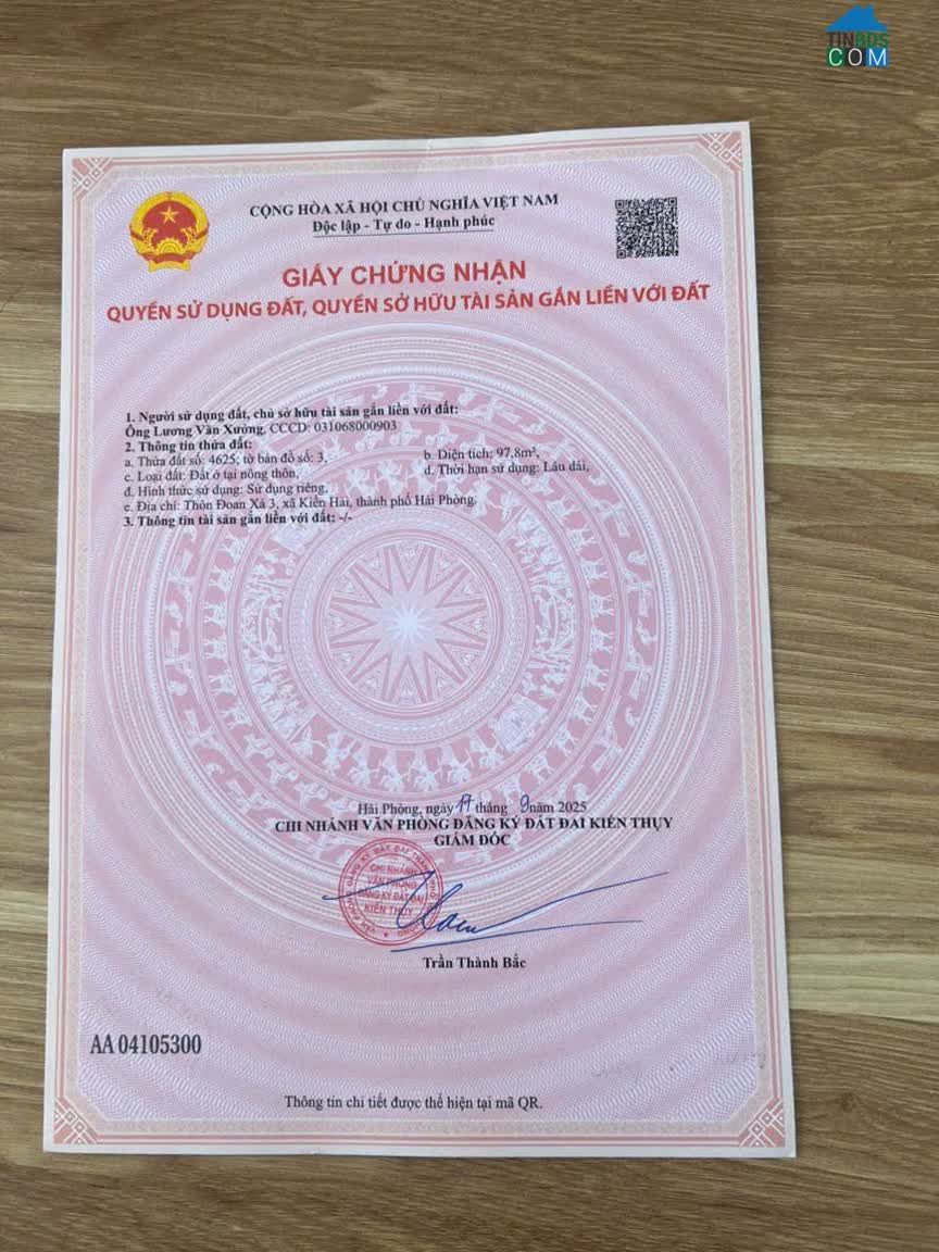 -Diện tích: 97,8m²-Mặt tiền: 5m-Hình thửa: Vuông vắn, dễ xây dựng-Đường trước đất: Đường nhựa phân lô rộng khoảng 7m, ô tô tránh nhau-Vị trí: Khu phân lô Đoàn Xá, Kiến Thụy, Hải Phòng-Hạ tầng: Đường mới trải nhựa, vỉa hè, điện nước đồng bộ-Xung quanh: Khu dân cư hiện hữu, nhiều nhà xây mới, không gian thoáng-Pháp lý: Sổ đỏ cá nhân, thời hạn sử dụng lâu dài-Giá: 23, x triệu/m²