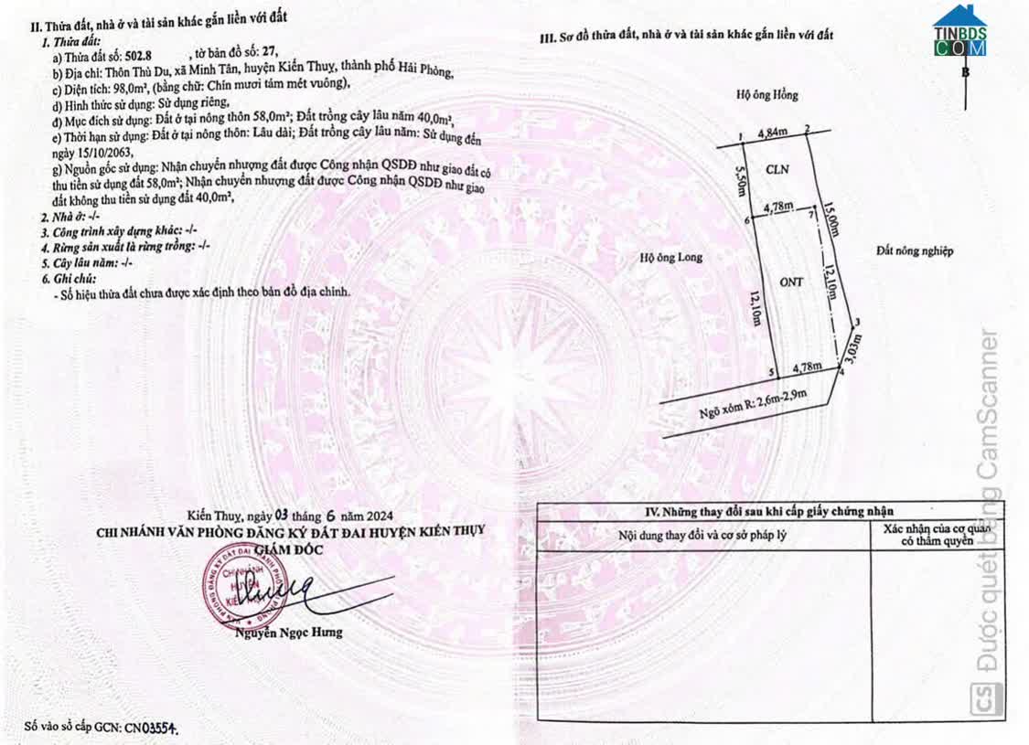 -Diện tích: 98m²-Mặt tiền: 4,78m-Đường trước đất: ngõ nhựa áp phan rộng khoảng 4m-Vị trí: thôn Thù Du, xã Minh Tân, Kiến Thụy, Hải Phòng-Khoảng cách: cách đường nhựa chính khoảng 30m, khu phân lô sau 2 lô mặt đường-Hiện trạng: đất vuông vắn, dễ bố trí xây dựng-Khu vực: dân cư hiện hữu, giao thông thuận tiện-Pháp lý: sổ đỏ