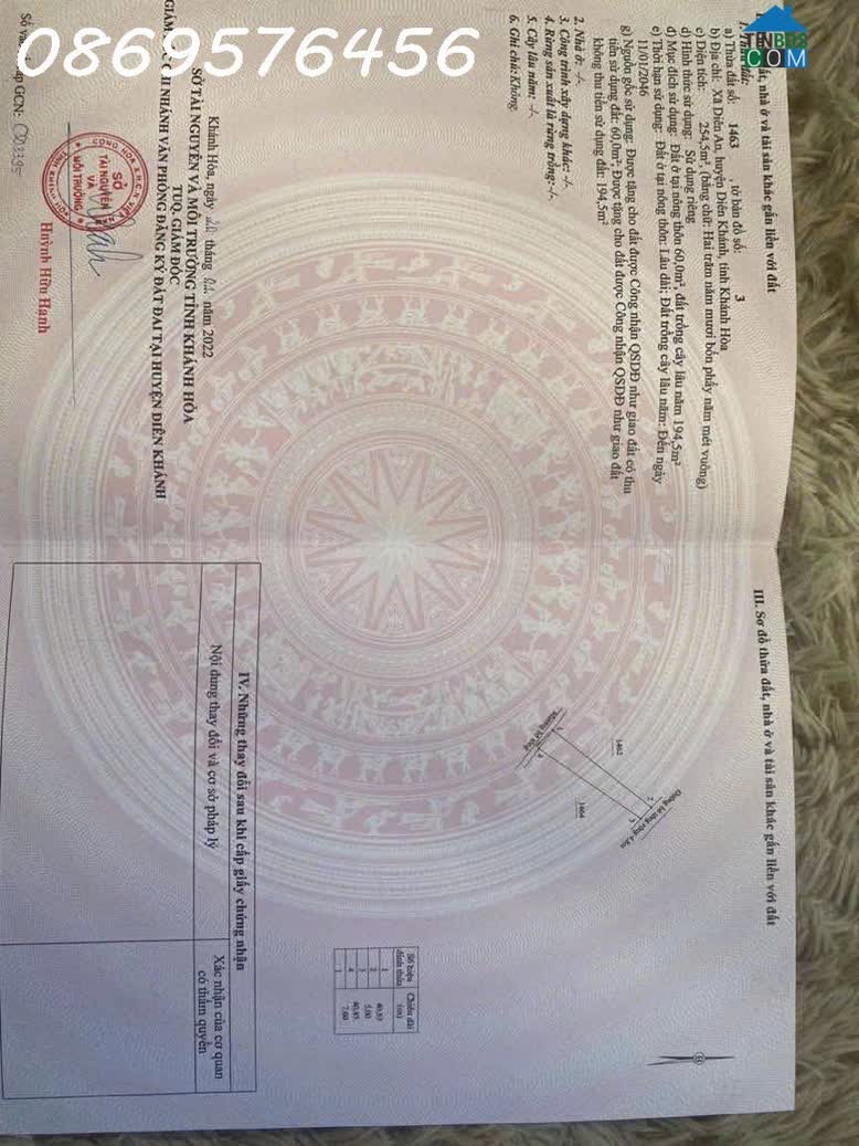 BÁN LÔ ĐẤT Ở DIÊN AN, DIÊN KHÁNH, KHÁNH HOÀ. ĐƯỜNG Ô TÔ THÔNG NHAU VI VU. DT: 254 mét (ngang 5m nở hậu 7. 6 mét), có 60 mét thổ cư, còn lại cây Lâu Năm, QH fu..