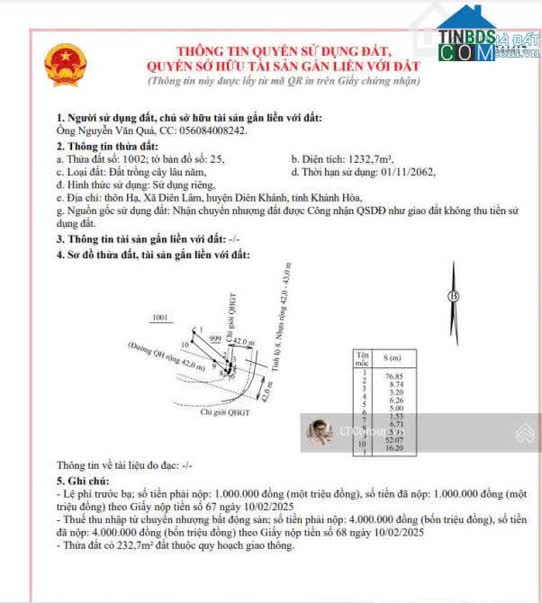 Bán 16 lô full thổ cư trung tâm xã Diên Phước (xã Diên Thọ mới) Diện tích: 130-200m2 (62-145m2 thổ cư) Pháp lý sổ hồng, đường rộng 6, 5-7m (qh rộng 23m) Cách..
