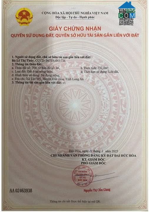 BÁN ĐẤT TẠI TÂN PHÚ – ĐỨC HÒA – LONG AN - Địa chỉ: Xã Tân Phú, huyện Đức Hòa, tỉnh Long An - Diện tích: 3. 379 m² - Đường trước đất 3m, xe bán tải, xe hơi..