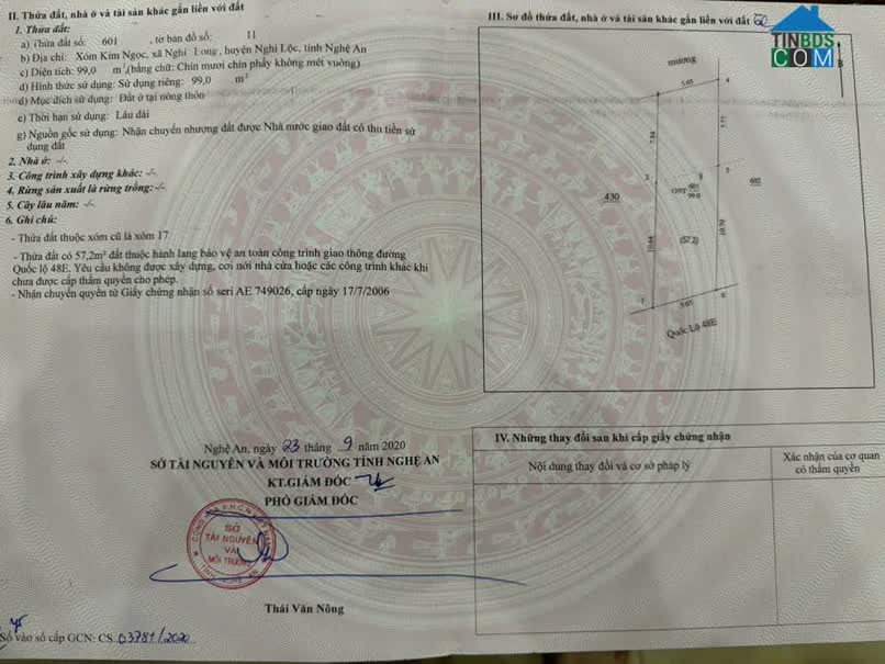 Lô đất 131m2 mặt đường 24m Uỷ Ban Xã Nghi Phong (sáp nhập TP Vinh) Cách trường học, đèn đỏ đường 72M chỉ 200m - Diện tích: 131 m2 - Mặt tiền: gần 6m - Hướng: Đ..