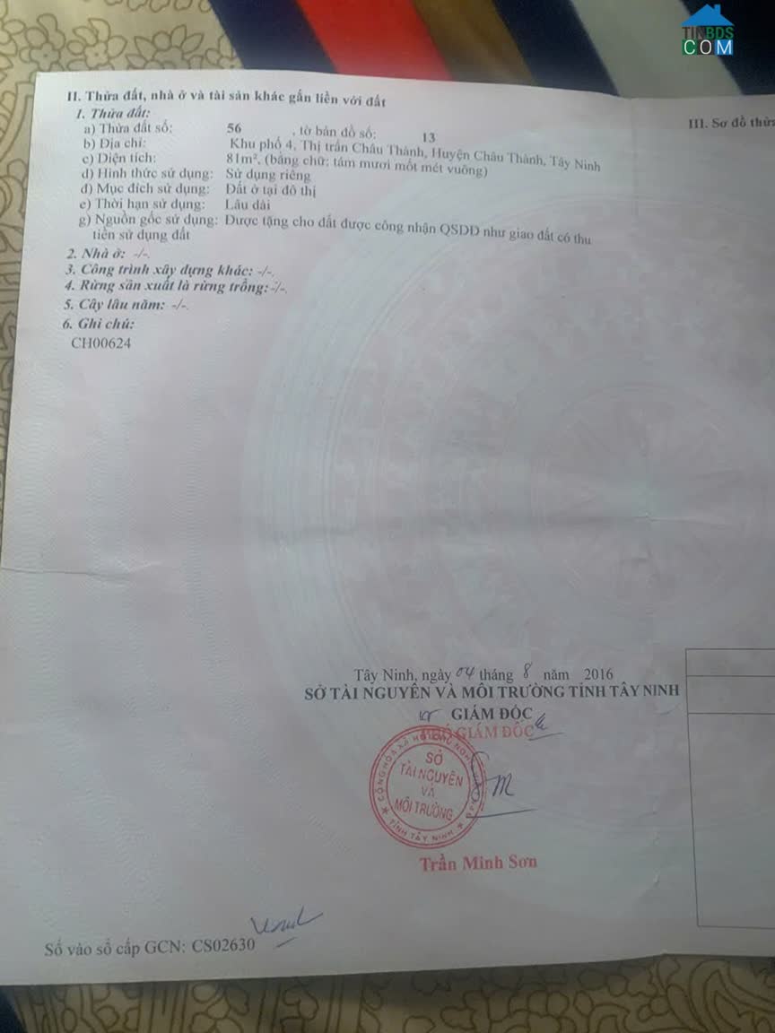 CHÍNH CHỦ CẦN BÁN 02 LÔ ĐẤT CÓ VỊ TRÍ ĐẸP TẠI HUYỆN CHÂU THÀNH - TÂY NINH. * Lô 1: + Vị trí: Tam Hạp, Xã Thái Bình Châu, Châu Thàn..