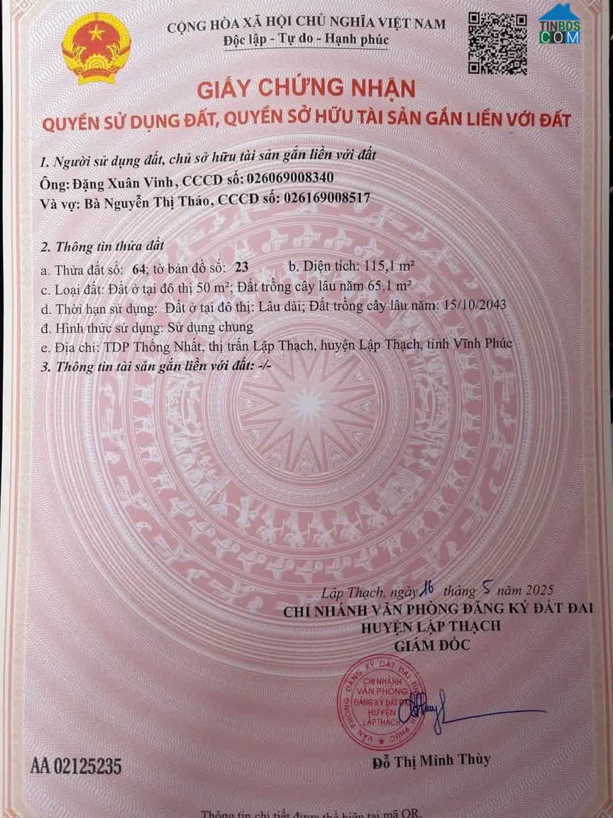 Chính chủ cần bán lô đất tại Thôn Hạ - Xã Ngọc Mỹ - Huyện Lập Thạch – Tỉnh Vĩnh Phúc. Diện tích: 528, 5m2. Vị trí: đất đẹp, giao thông thuận tiện, dân cư thân th..