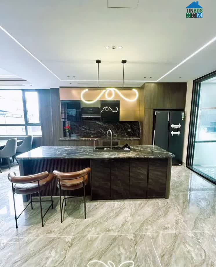 - Nội thất cao cấp: Sàn gỗ sang trọng tại các phòng ở, sàn gạch vân đá tinh tế ở khu vực tầng 1 và các phòng chức năng. Hệ thống đèn chiếu sáng âm trần và đèn hắt trần tạo không gian ấm cúng, hiện đại.